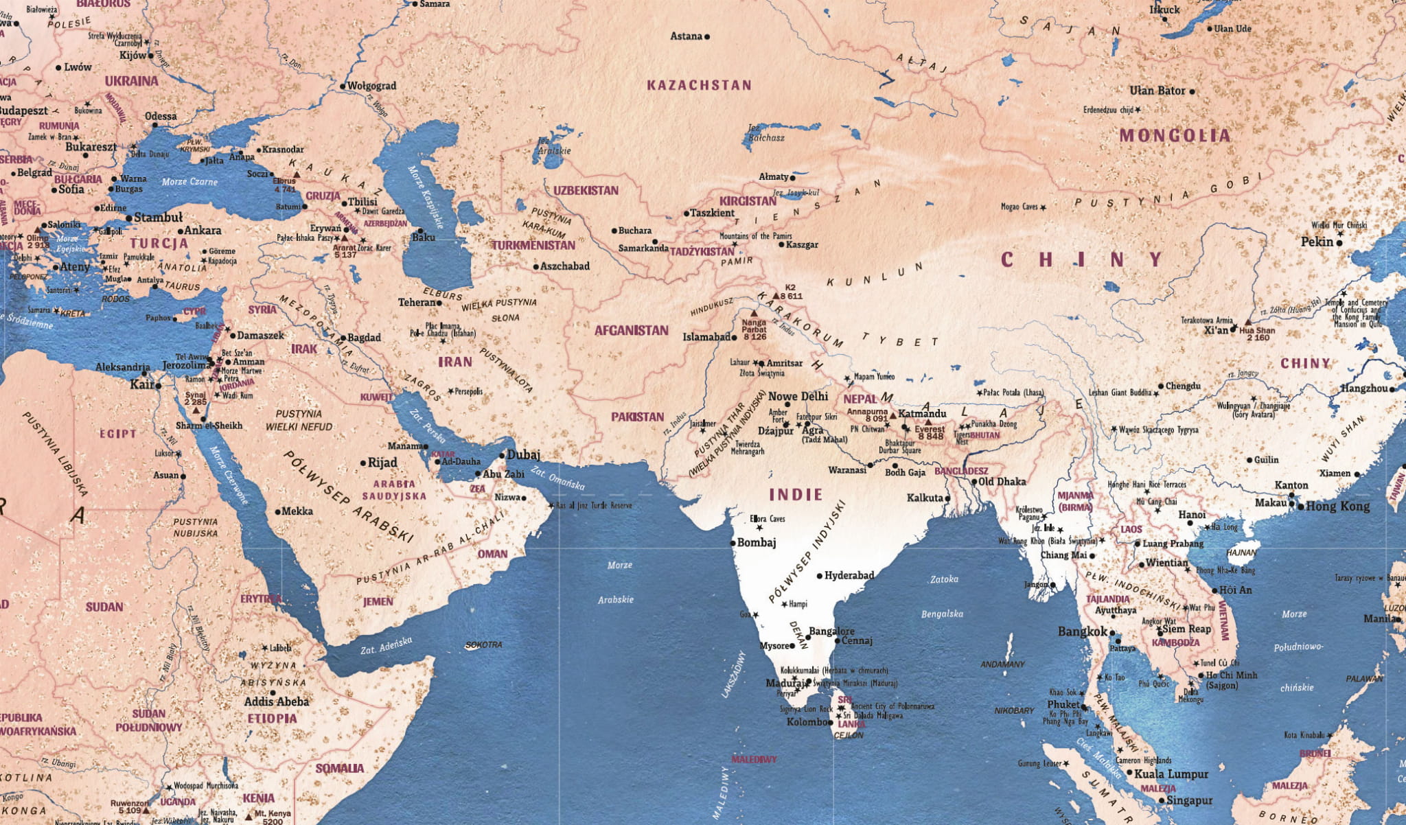 Akwarelowa turystyczna mapa świata – miękkie, „malarskie” przejścia kolorów + ponad 1000 atrakcji turystycznych.